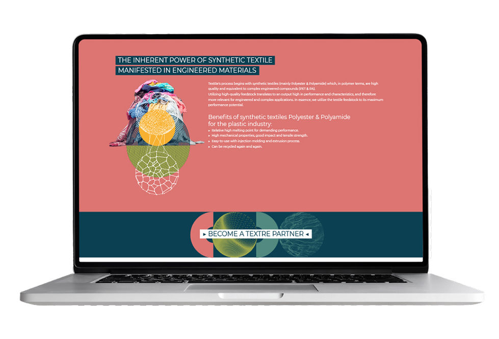 חברת TEXTRE הוקמה וגייסה כספים ותפקידנו היה לעזור לחברה לשקף ויזואלית את קפיצת המדרגה מרעיון של יזמית צעירה לחברה שמבינה את תעשיית הטקסטיל והפלסטיק, עושה פיילוטים ומתקדמת לייצור ומכירות.